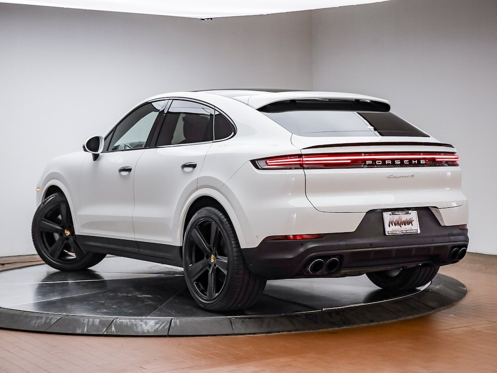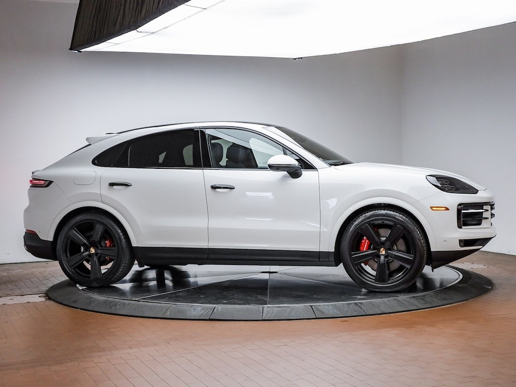 Certified. White 2025 Porsche Cayenne Coupe S AWD 8-Speed Automatic with Tiptronic V8 14-Way Power Seats w/Comfort Memory, 4-Zone Climate Control, Adaptive Air Suspension w/PASM, Adaptive Cruise Control w/Lane Keep Assist (LKA), BOSE Surround Sound System, Door Handles in High Gloss Black, Front Massage Seat Function w/Fr Ventilated Seats, Front Ventilated Seats, HD-Matrix Design LED Headlights in Black, Head-Up Display, Heated Windshield, Passenger Display, Porsche InnoDrive w/ACC & ALK, Premium Package Plus, Rear Axle Steering, Rear Comfort Seats (2+1), Rear Heated Seats, Sport Chrono Package w/Compass Display, Sport Exhaust System w/Tailpipes in Black/Silver, Under Door Puddle Light Projectors, Wheels: 21" Exclusive Design in Satin Black.