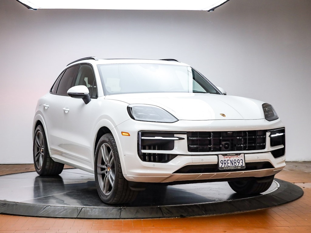 Certified. White 2025 Porsche Cayenne AWD 8-Speed Automatic with Tiptronic 3.0L V6 Black Leather, 14-Way Power Seats w/Comfort Memory, 4-Zone Climate Control, Adaptive Cruise Control w/Lane Keep Assist (LKA), BOSE Surround Sound System, Front Ventilated Seats, HD-Matrix Design LED Headlights, Panoramic Roof System, Premium Package Plus, Rear Heated Seats, SportDesign Package in High Gloss Black, Wheels: 21" Cayenne Excl Design in Vesuvius Grey.